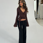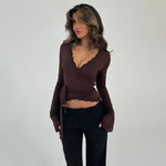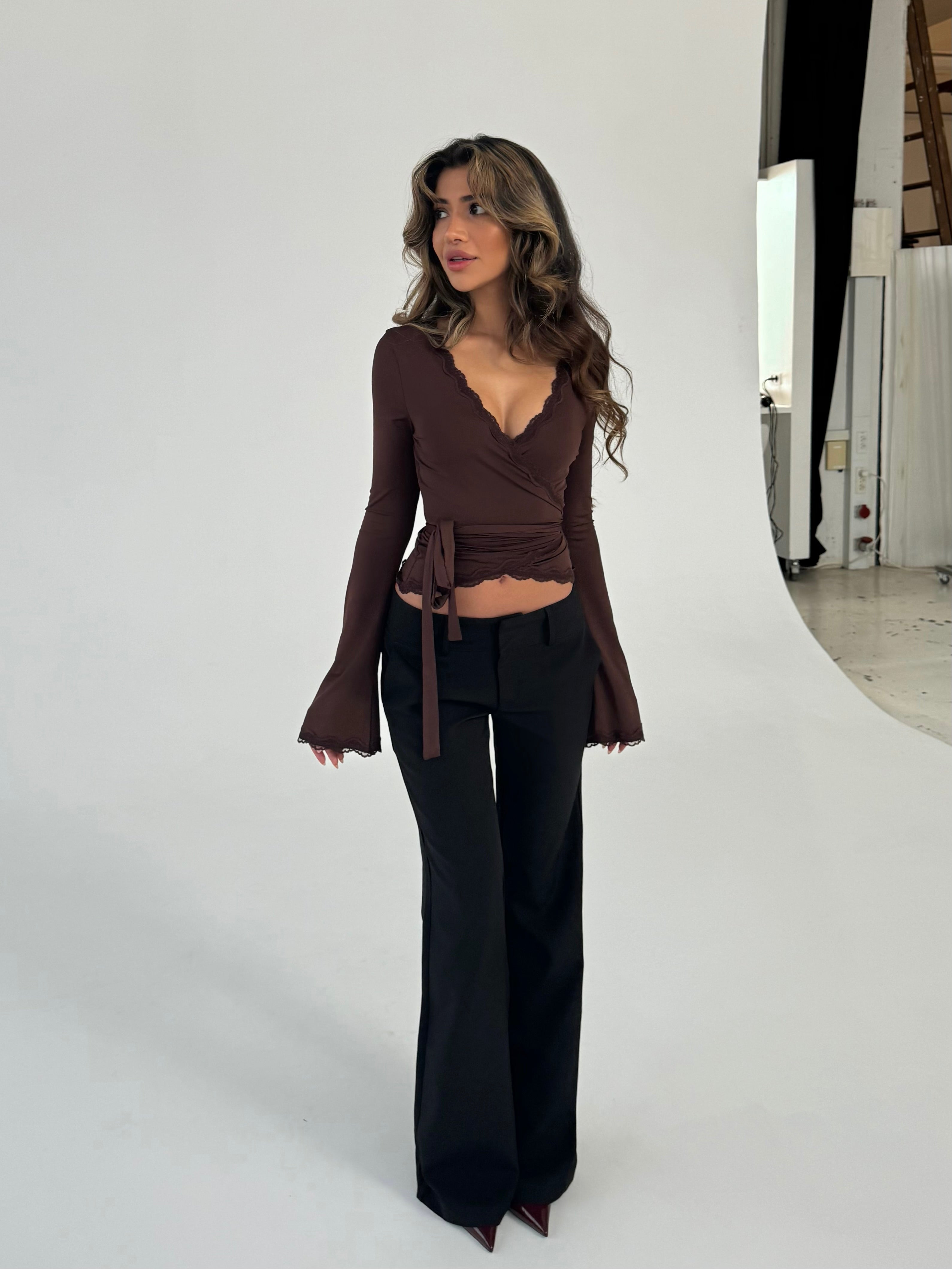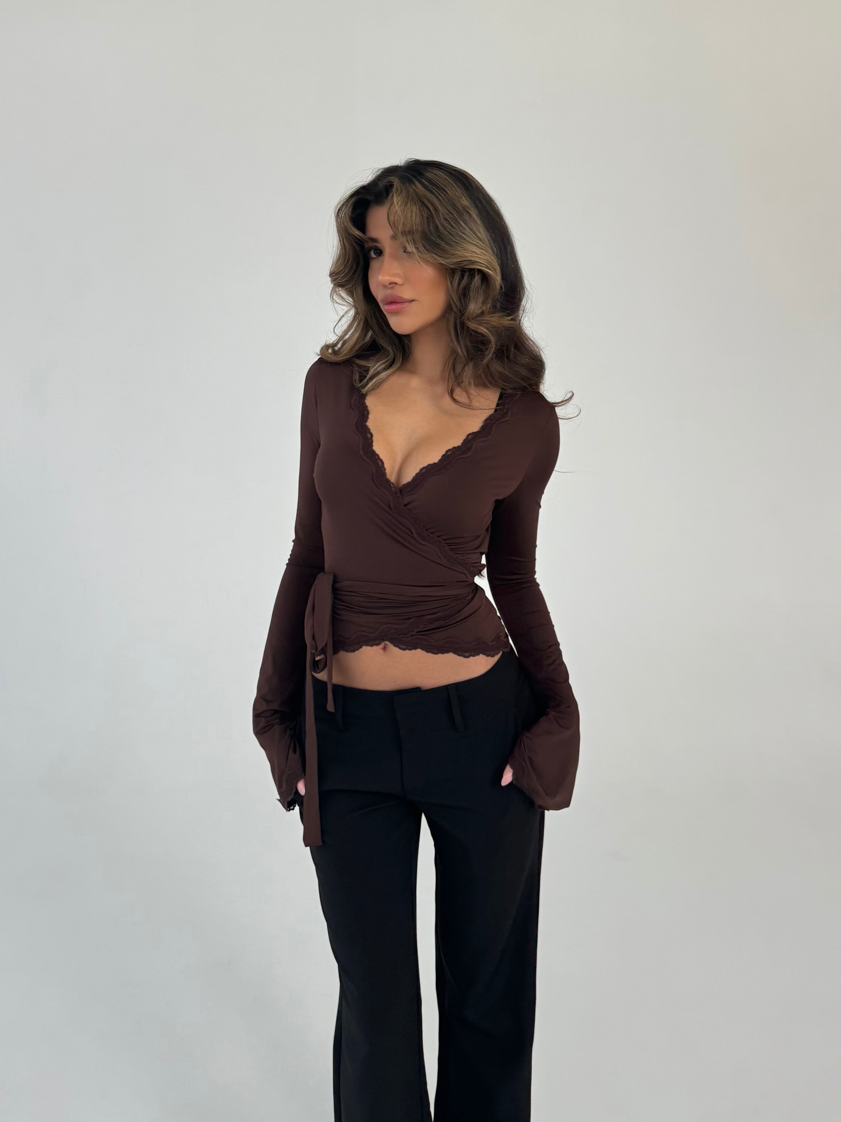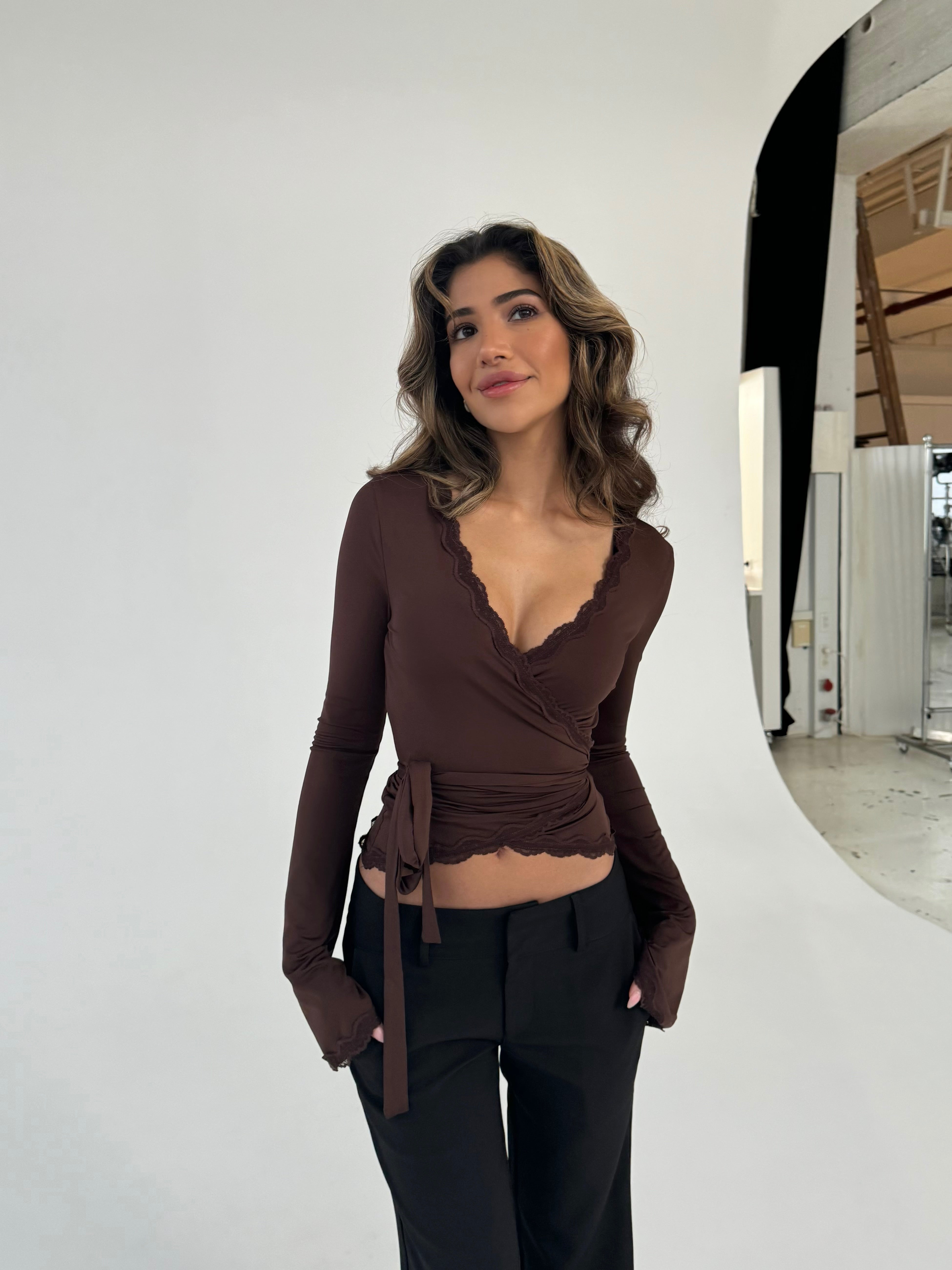 Beautiful wrap top in the softest material with very stretch that sits nicely to the body. The top has long sleeves and a deep cut.