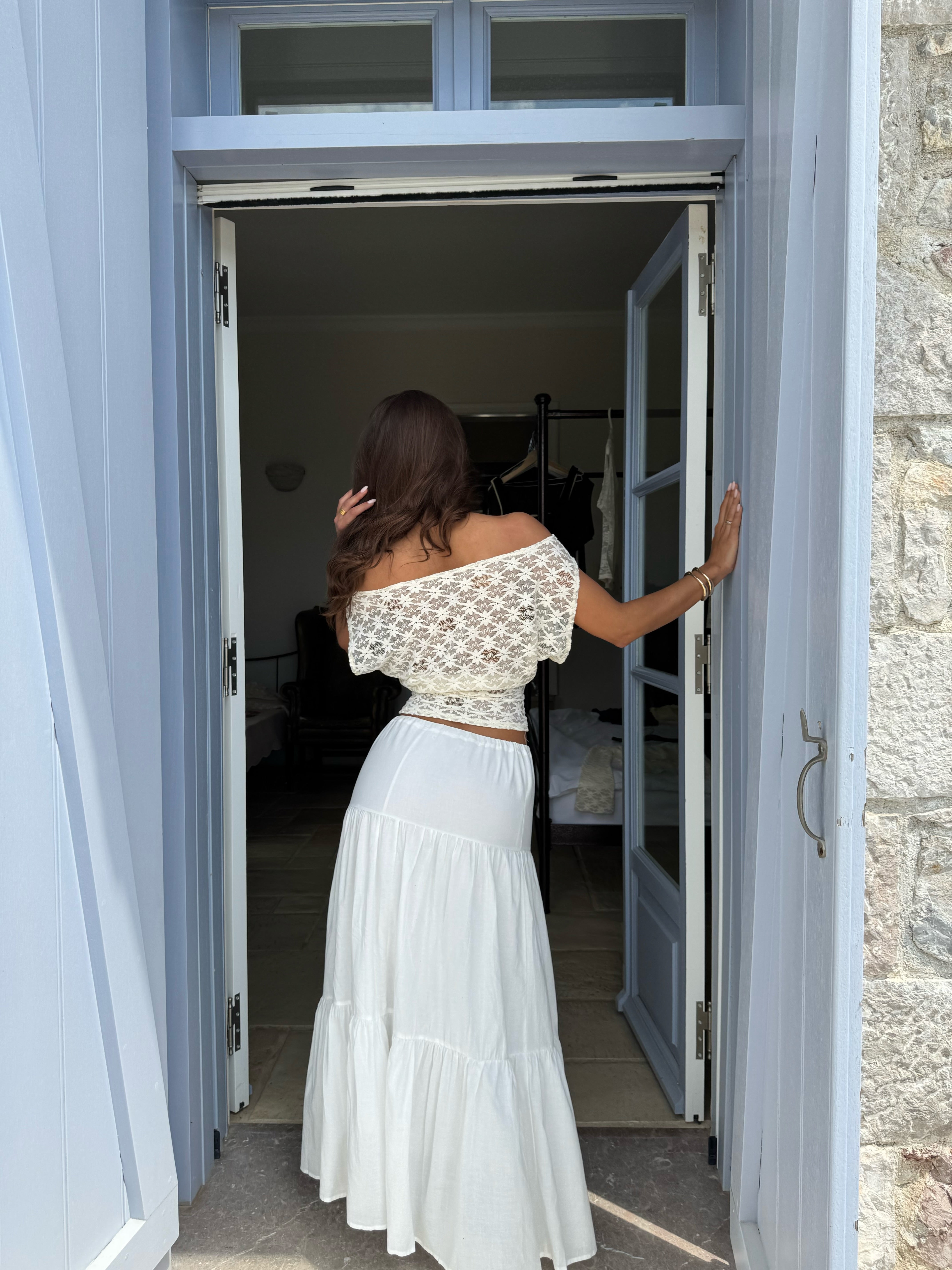Beautiful lace top that can be styled in different ways. It can be worn both off-shoulder and one-shoulder. The top has a lot of stretch.