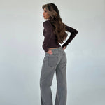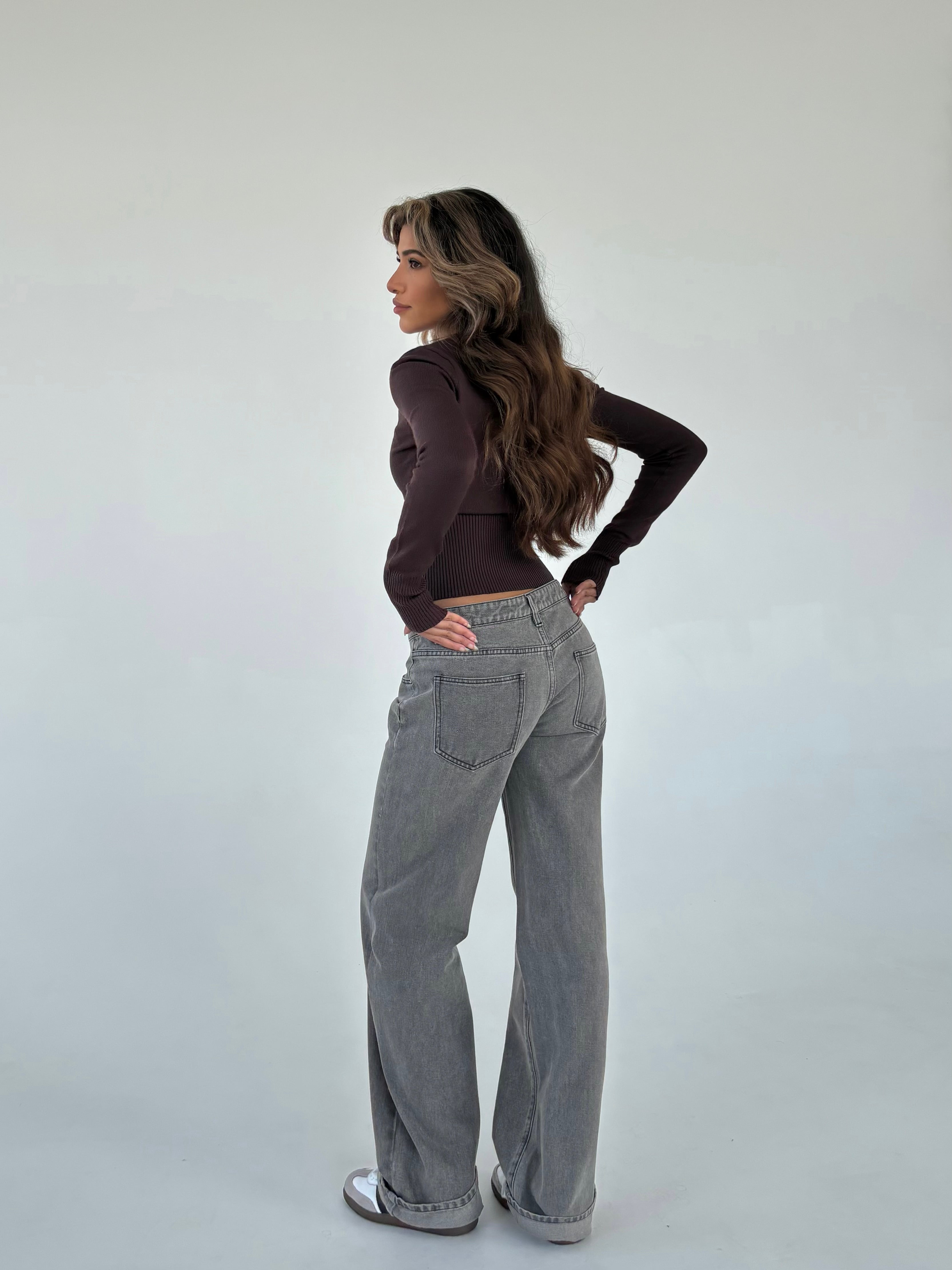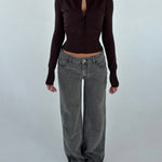 Grey jeans in the coolest loose fit. The trousers are quite low waisted.