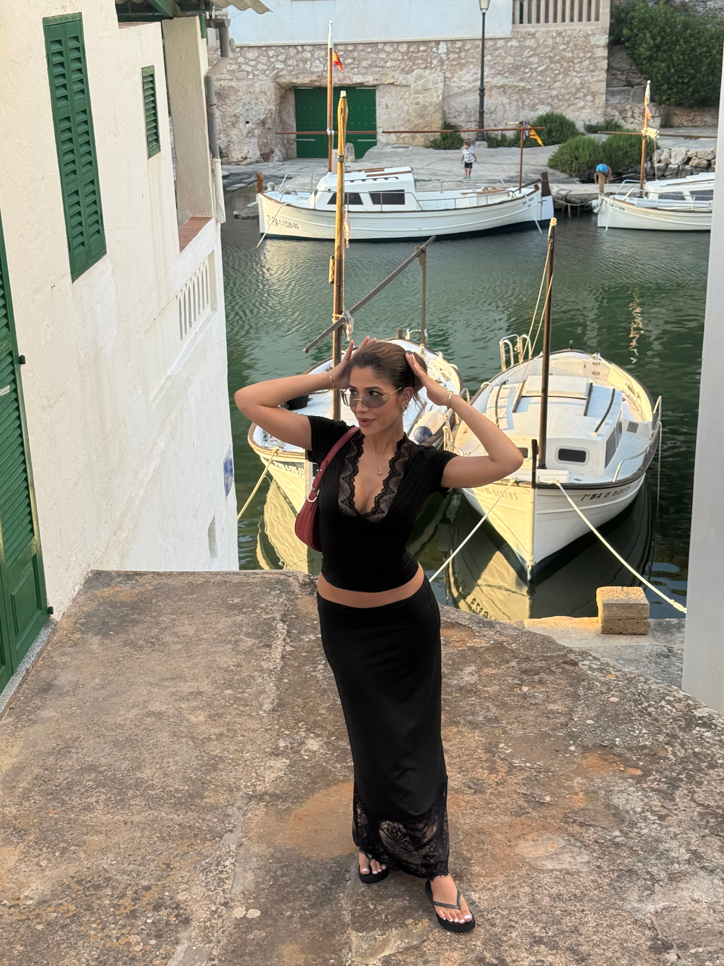 Maxi skirt in our lovely soft basic material, with lace at the bottom. It falls beautifully and fits true to size.
