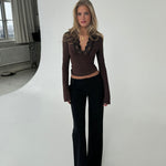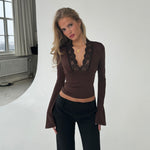 Beautiful top with lace edge in material with a lot of stretch, which fits the body nicely. The top has long sleeves and a deep neckline.
