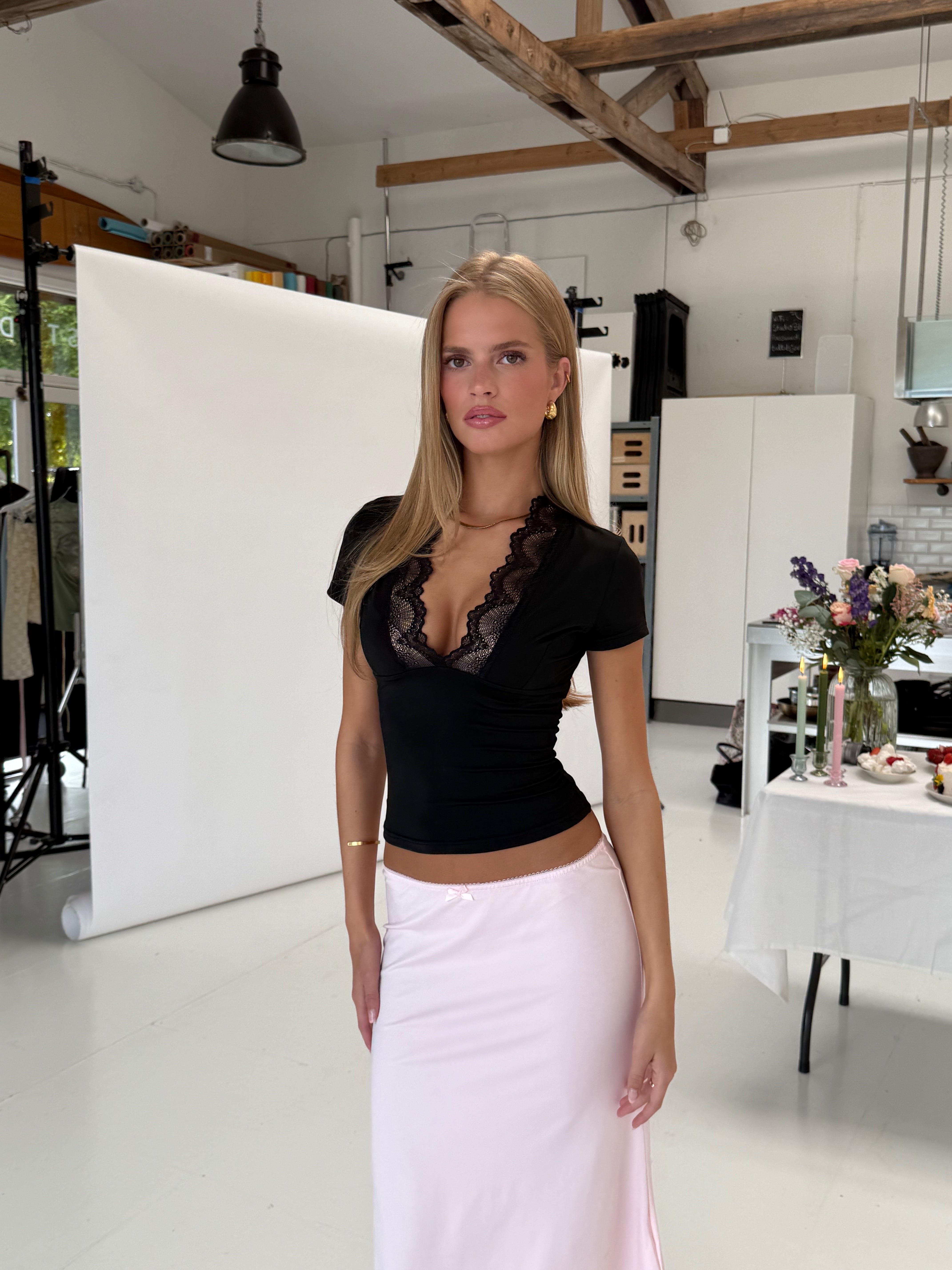 Beautiful tee in the softest material with plenty of stretch, fitting beautifully to the body. The top features lace along the edges.