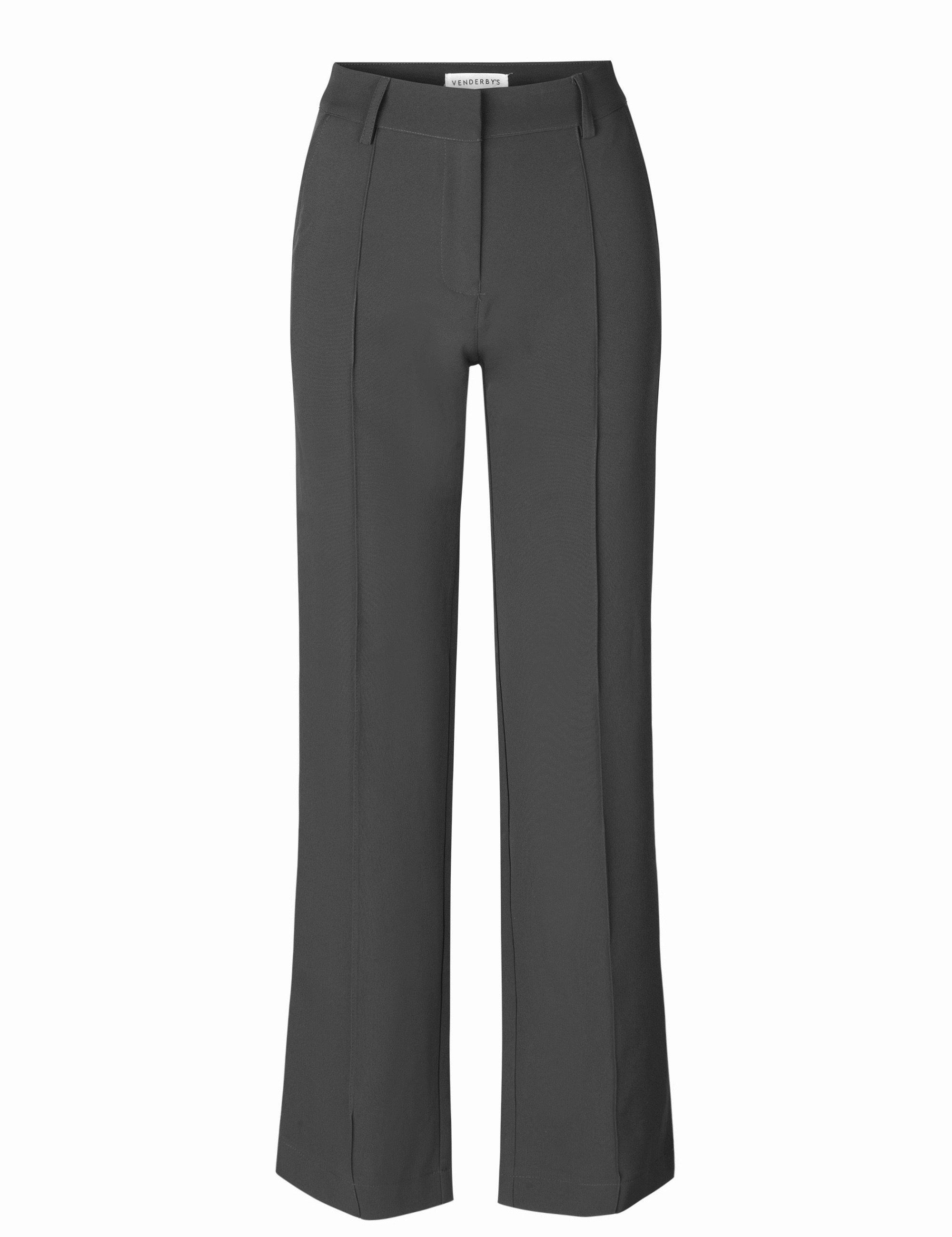 Trousers in dark grey, slightly high-waisted, with a bit of stretch. The trousers are a straight model with quite a bit of width. The trousers have belt straps and a nice seam in the middle that gives a classic look. The trousers are made of soft material that is really comfortable and sits very well on the body.