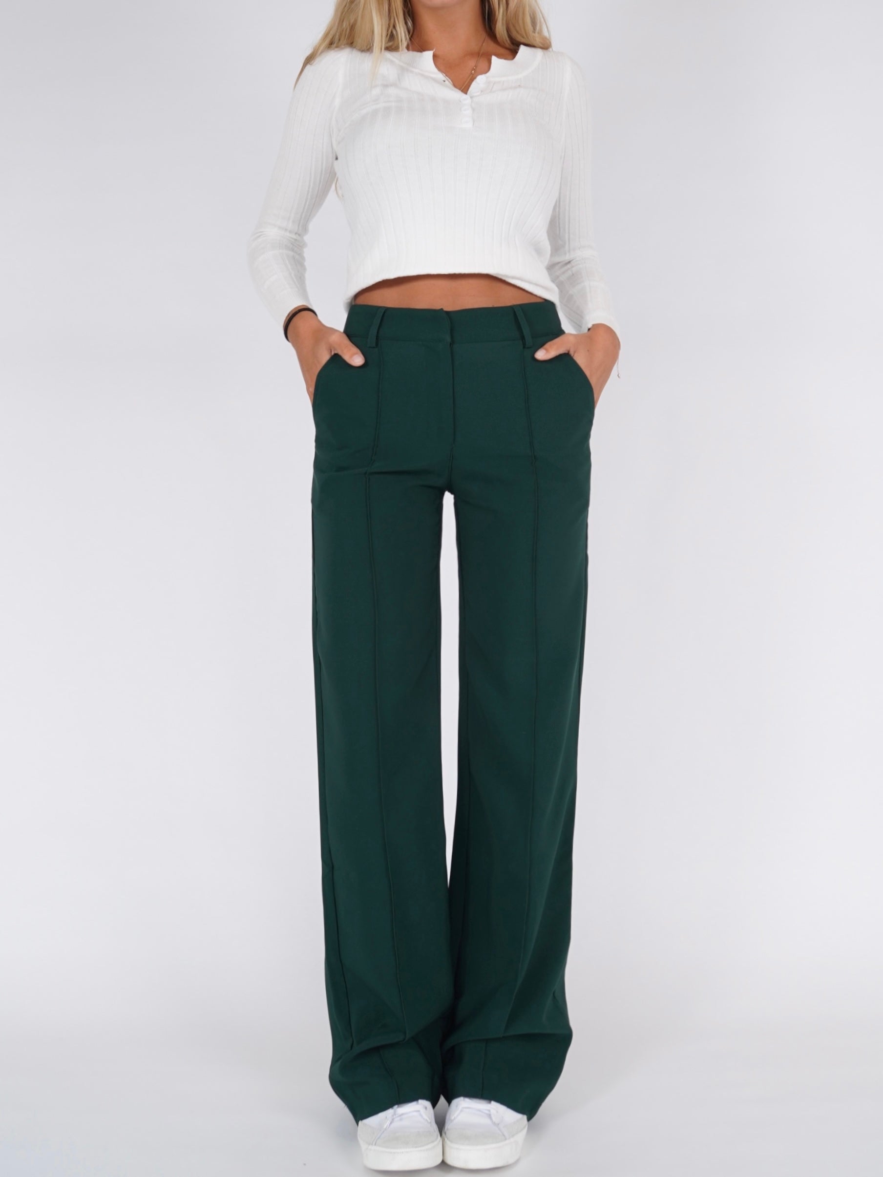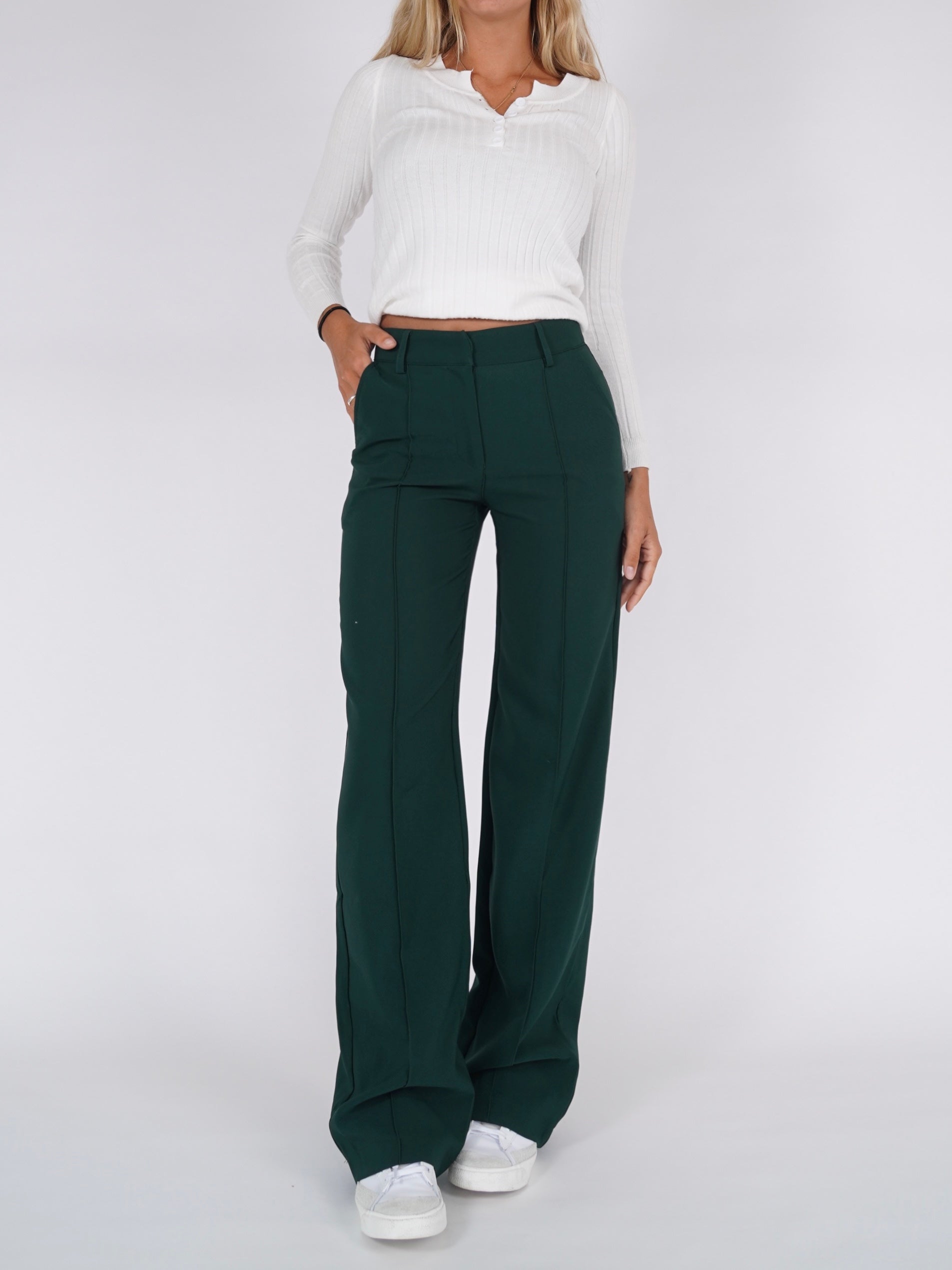 Our stylish Vera Wide trousers have a nice seam in the middle of each leg and are available in a straight model with plenty of width, which ensures you a sophisticated but also comfortable look - and here they are seen in our fantastic bottle green shade. If you want some trendy everyday trousers that you can also dress up, buy Vera Wide trousers in dark green.
