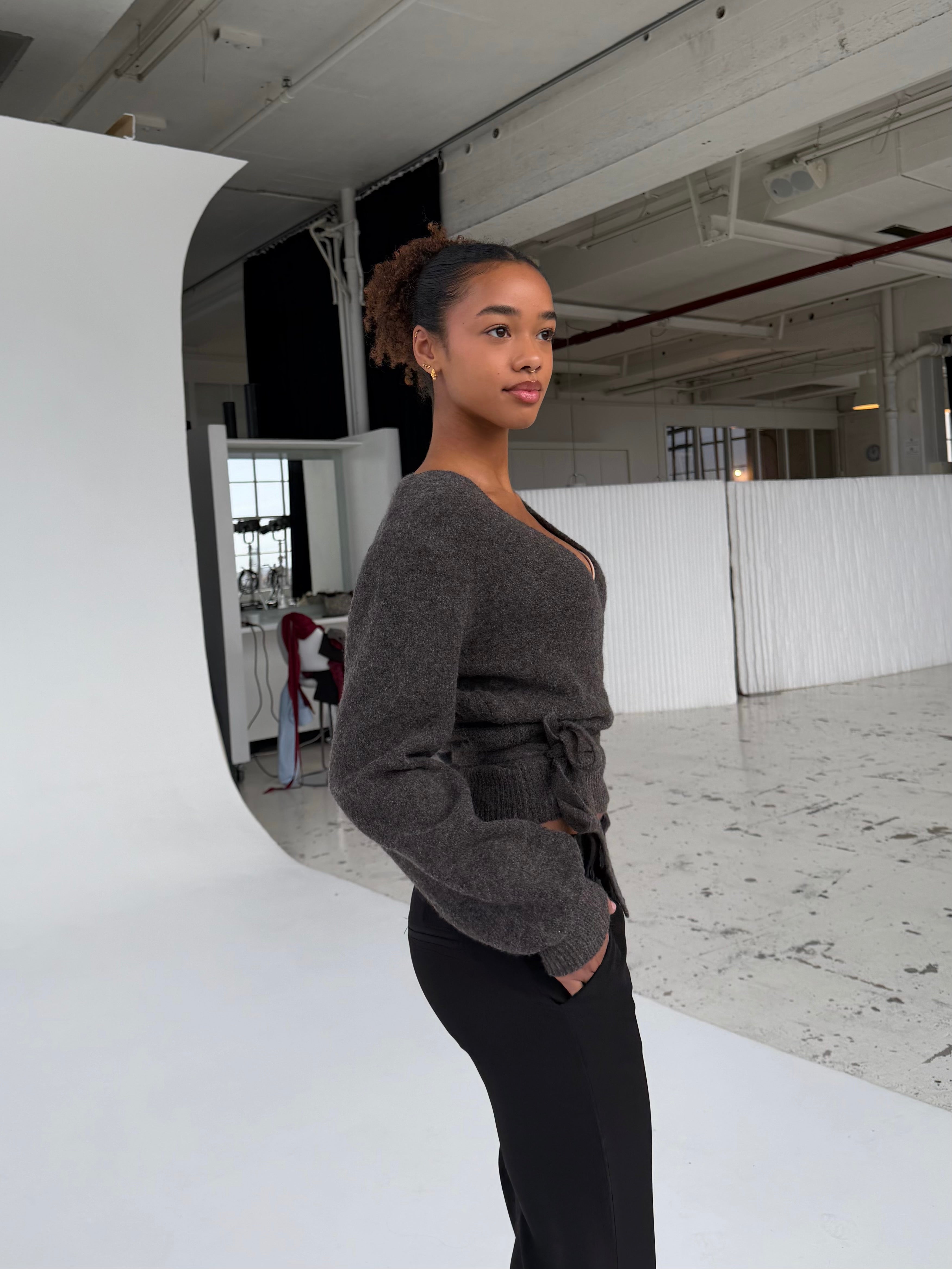 Cardigan in the softest material, made from a wool blend. It is tied at the side and can be tightened as desired.